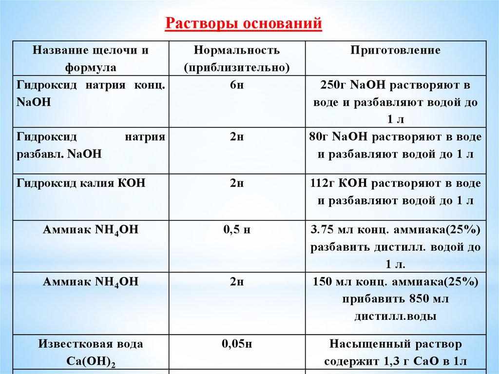 Растворы основанийНазвание щелочи и