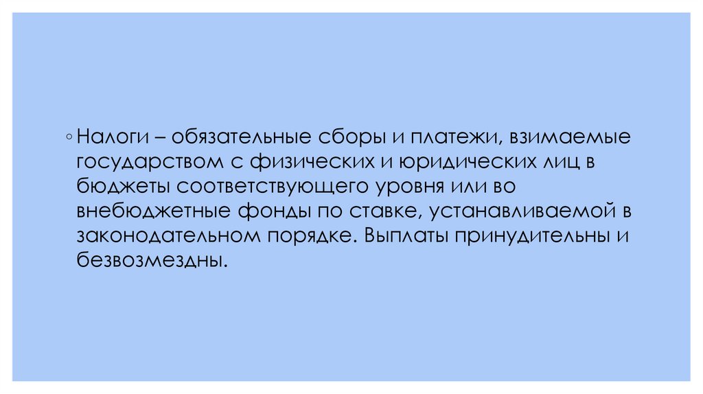 ◦ Налоги – обязательные сборы и платежи, взимаемыегосударством с физических и юридических лиц в