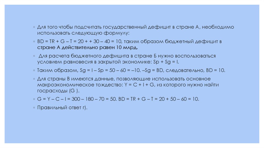 ◦ BD = TR + G – T = 20 + + 30 – 40 = 10, таким образом бюджетный дефицит в