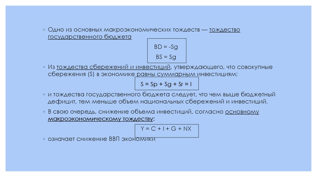 ◦ Одно из основных макроэкономических тождеств — тождествогосударственного бюджета