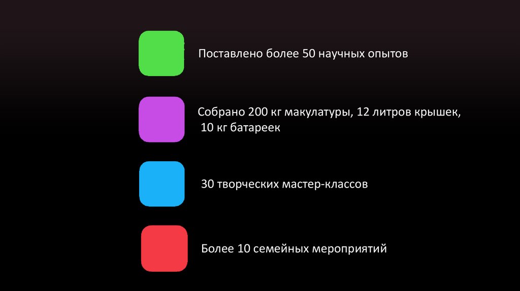 Поставлено более 50 научных опытовСобрано 200 кг макулатуры, 12 литров крышек,