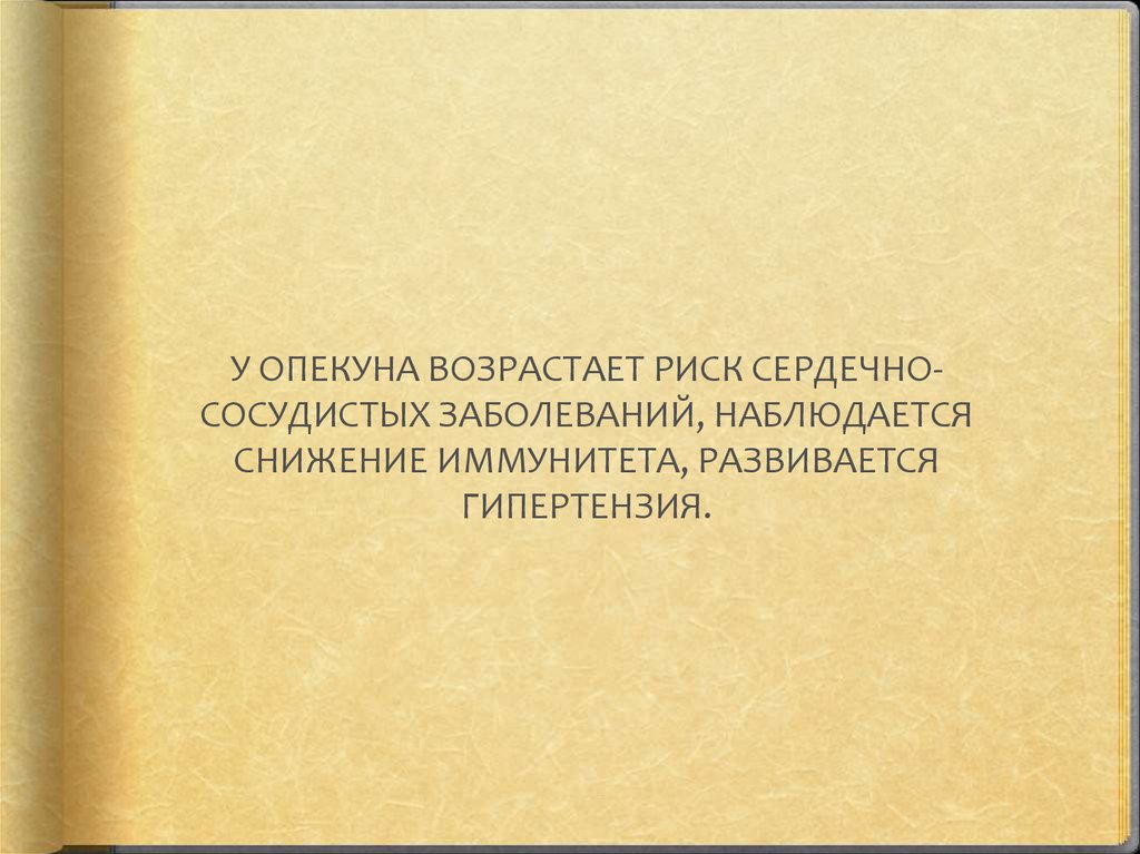 У ОПЕКУНА ВОЗРАСТАЕТ РИСК СЕРДЕЧНОСОСУДИСТЫХ ЗАБОЛЕВАНИЙ, НАБЛЮДАЕТСЯСНИЖЕНИЕ ИММУНИТЕТА, РАЗВИВАЕТСЯ
