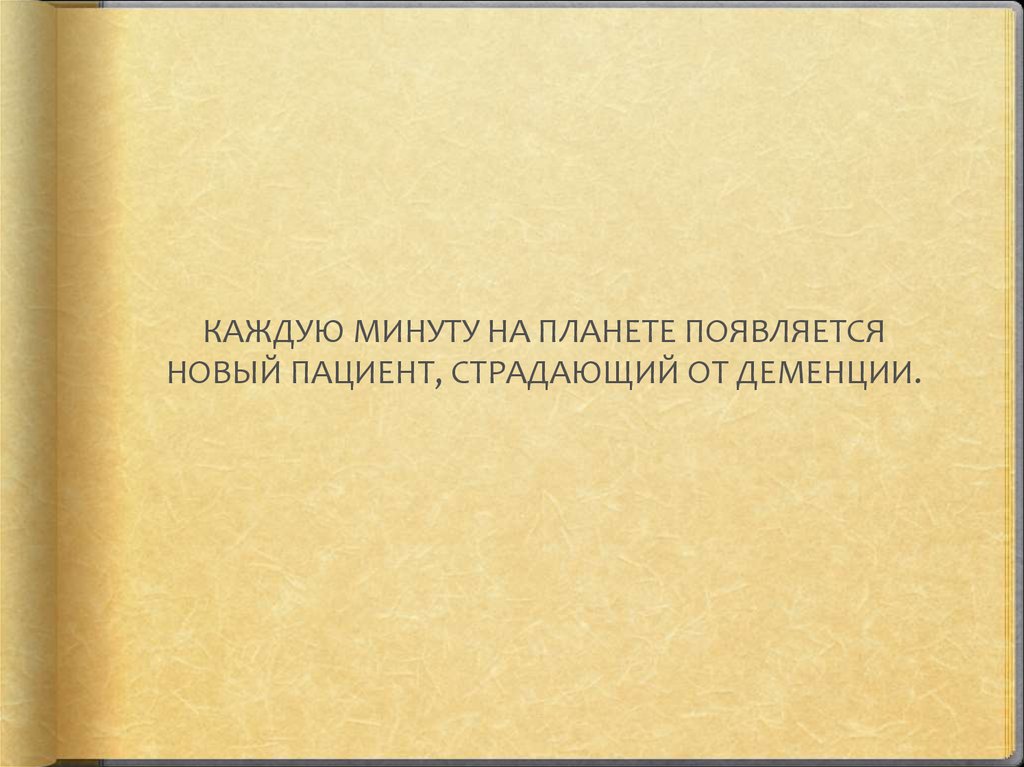 КАЖДУЮ МИНУТУ НА ПЛАНЕТЕ ПОЯВЛЯЕТСЯНОВЫЙ ПАЦИЕНТ, СТРАДАЮЩИЙ ОТ ДЕМЕНЦИИ.