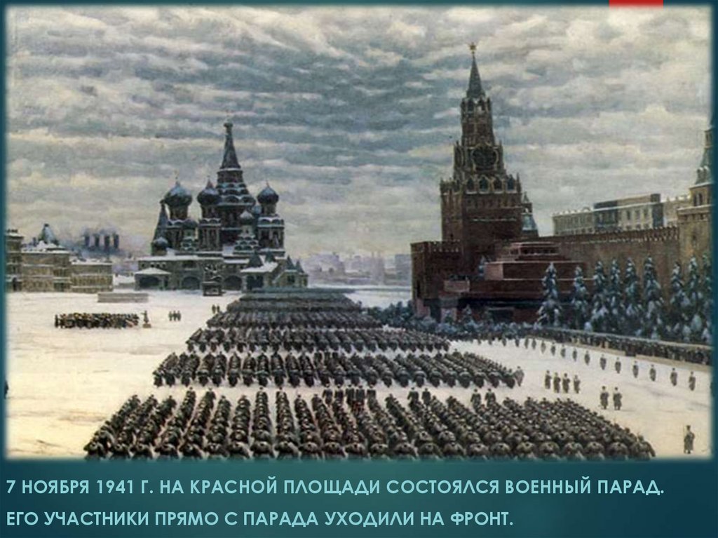 7 НОЯБРЯ 1941 Г. НА КРАСНОЙ ПЛОЩАДИ СОСТОЯЛСЯ ВОЕННЫЙ ПАРАД.ЕГО УЧАСТНИКИ ПРЯМО С ПАРАДА УХОДИЛИ НА ФРОНТ.