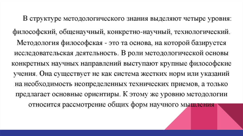 В структуре методологического знания выделяют четыре уровня:философский, общенаучный, конкретно-научный, технологический.