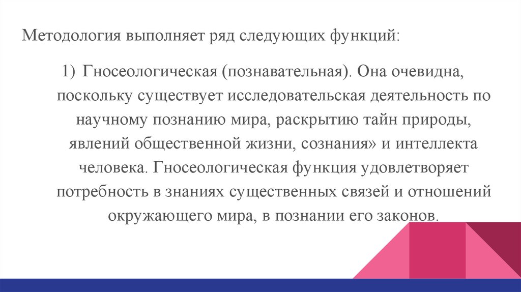 Методология выполняет ряд следующих функций:1) Гносеологическая (познавательная). Она очевидна,