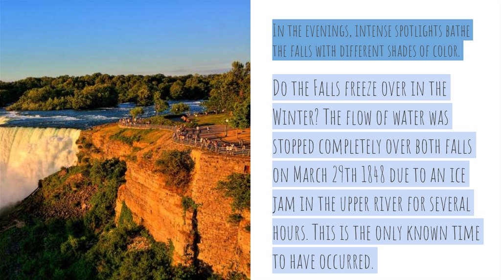 In the evenings, intense spotlights bathethe falls with different shades of color.