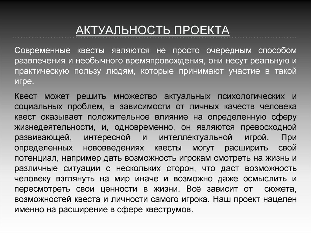 АКТУАЛЬНОСТЬ ПРОЕКТАСовременные квесты являются не просто очередным способом