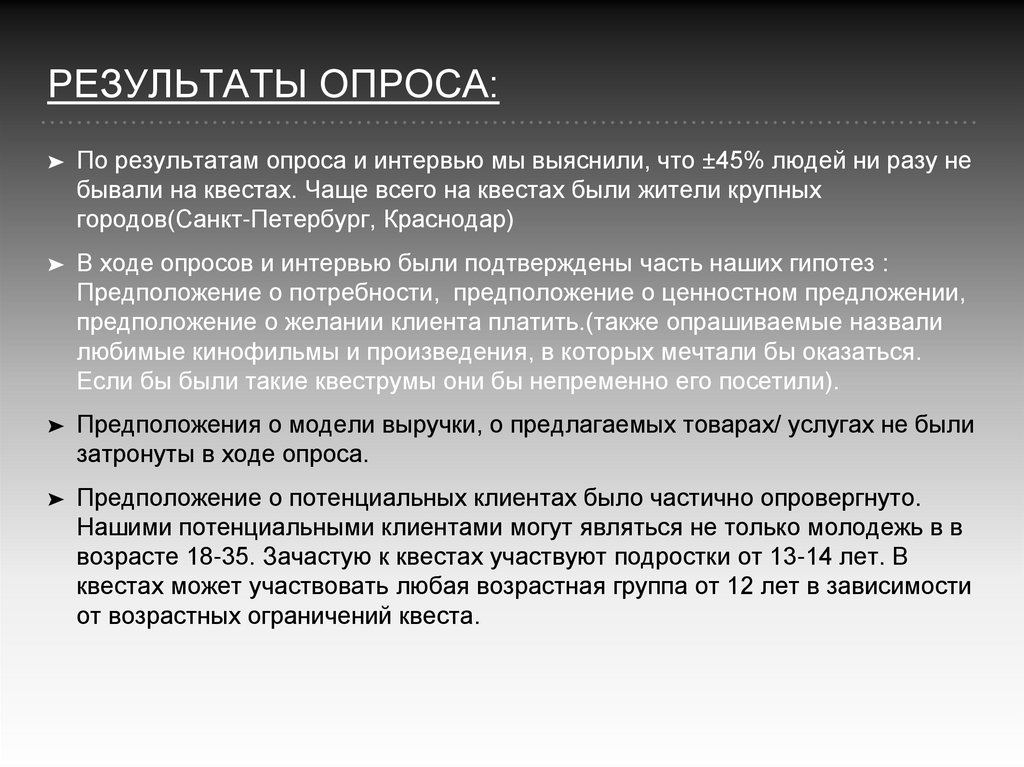 В ходе опросов и интервью были подтверждены часть наших гипотез :