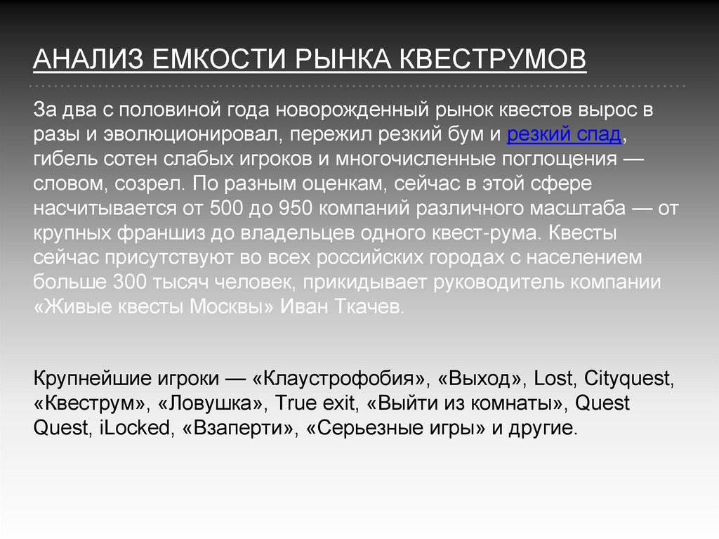 АНАЛИЗ ЕМКОСТИ РЫНКА КВЕСТРУМОВЗа два с половиной года новорожденный рынок квестов вырос в