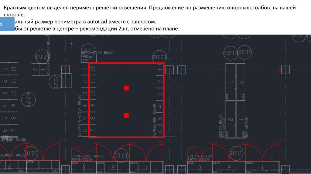Красным цветом выделен периметр решетки освещения. Предложение по размещению опорных столбов на вашейстороне.