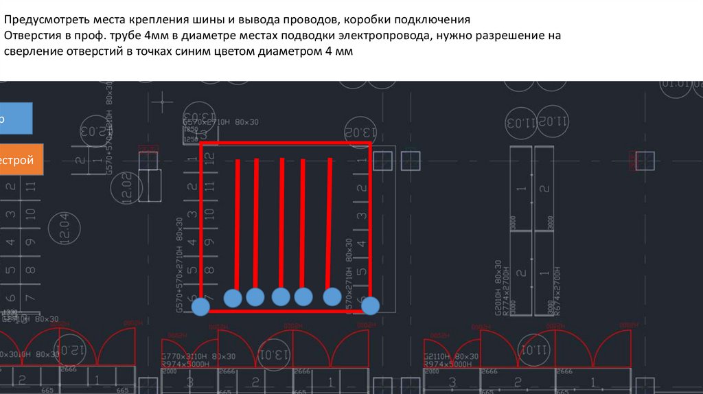 Предусмотреть места крепления шины и вывода проводов, коробки подключенияОтверстия в проф. трубе 4мм в диаметре местах подводки электропровода, нужно разрешение на