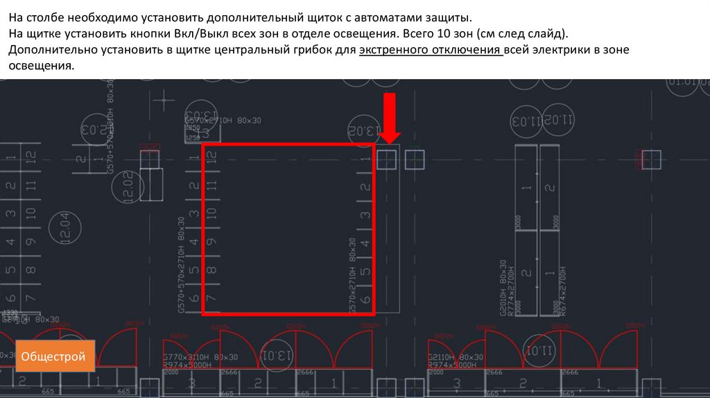На столбе необходимо установить дополнительный щиток с автоматами защиты.На щитке установить кнопки Вкл/Выкл всех зон в отделе освещения. Всего 10 зон (см след слайд).