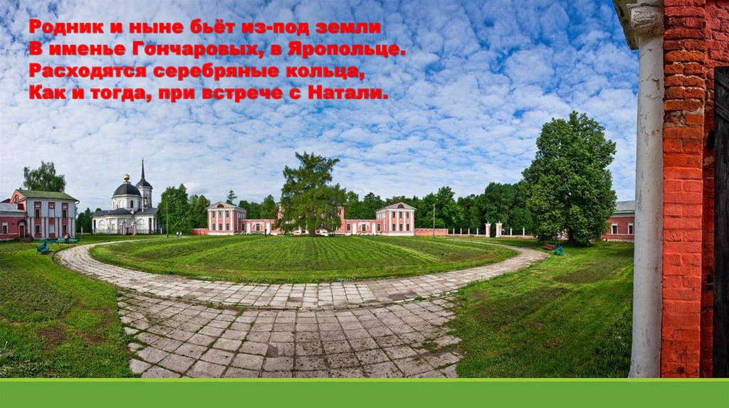Родник и ныне бьёт из-под землиВ именье Гончаровых, в Яропольце.