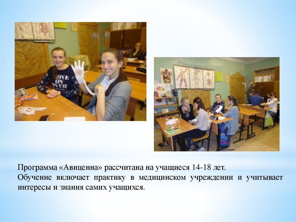 Программа «Авиценна» рассчитана на учащиеся 14-18 лет.Обучение включает практику в медицинском учреждении и учитывает