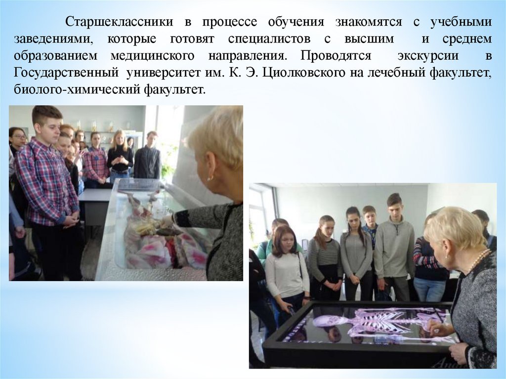 Старшеклассники посещают также Калужский базовый медицинскийколледж, где они могут побывать в учебных кабинетах и почувствовать