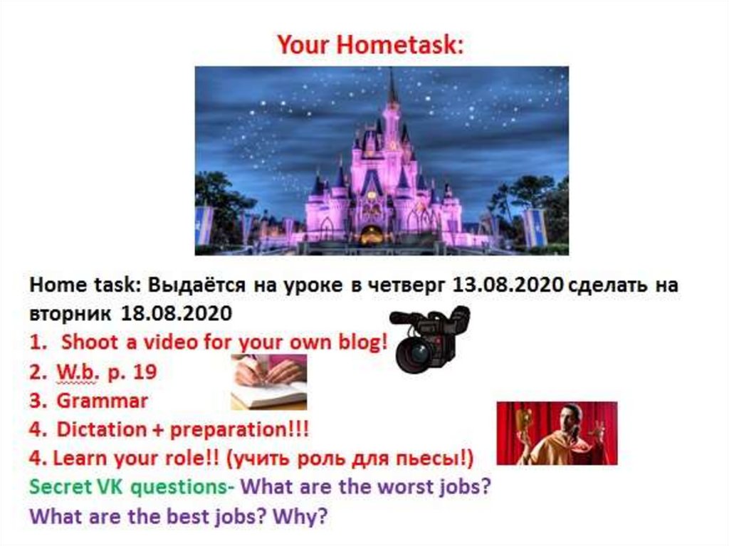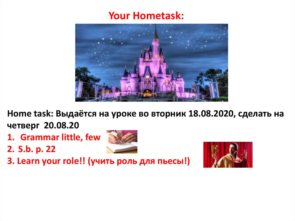 Your Hometask:Home task: Выдаётся на уроке во вторник 18.08.2020, сделать на