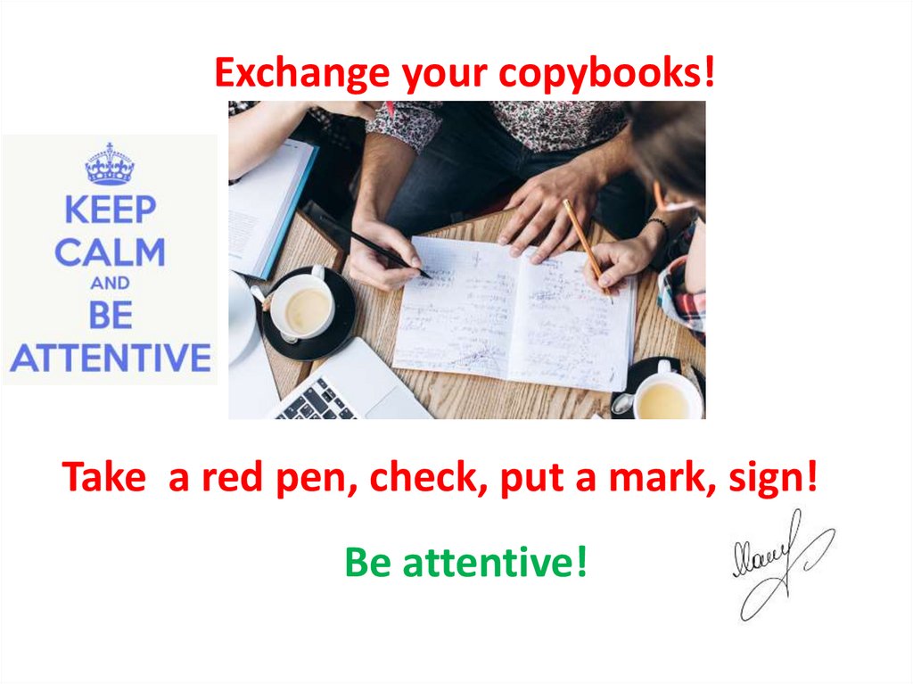 Exchange your copybooks!Take a red pen, check, put a mark, sign!