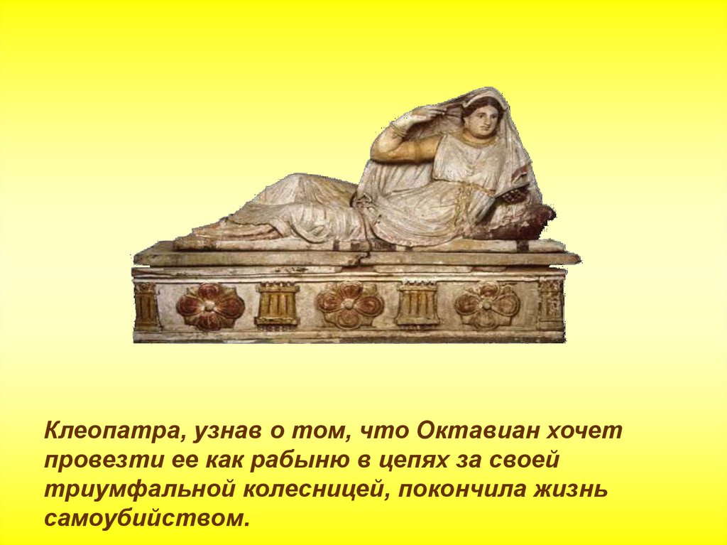 Клеопатра, узнав о том, что Октавиан хочетпровезти ее как рабыню в цепях за своей