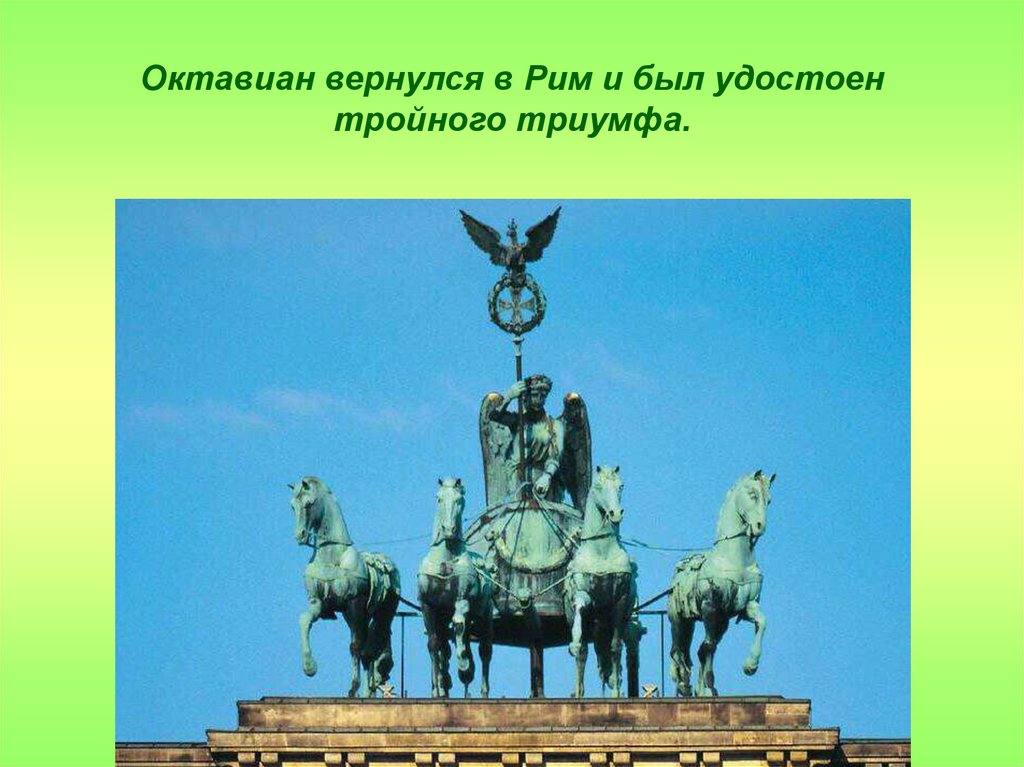 Октавиан вернулся в Рим и был удостоентройного триумфа.