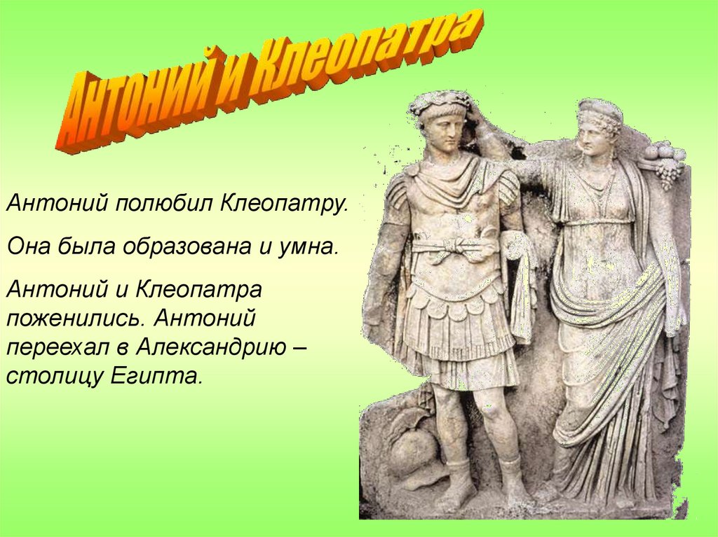 Антоний полюбил Клеопатру.Она была образована и умна.