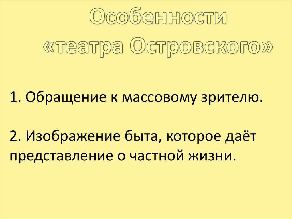 1. 1. Обращение к массовому зрителю. 2. Изображение быта, которое даёт представление о частной жизни.