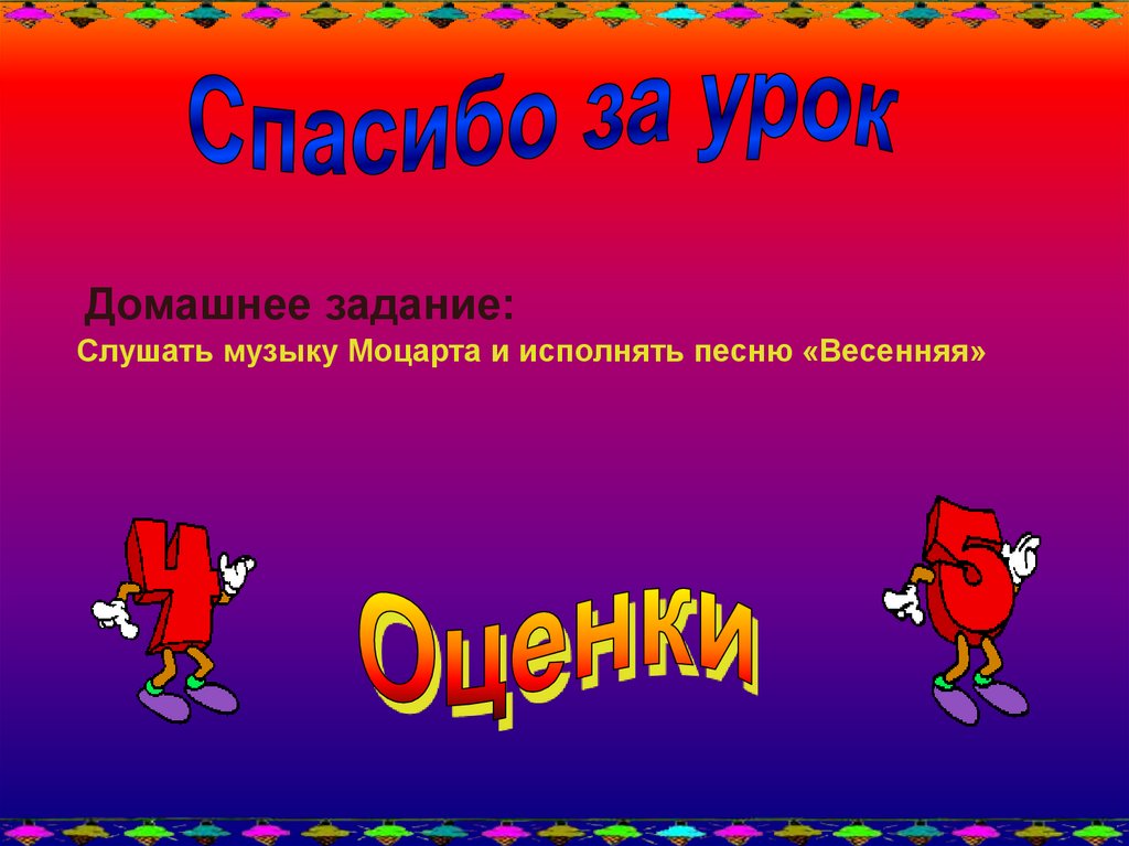 Домашнее задание:Слушать музыку Моцарта и исполнять песню «Весенняя»