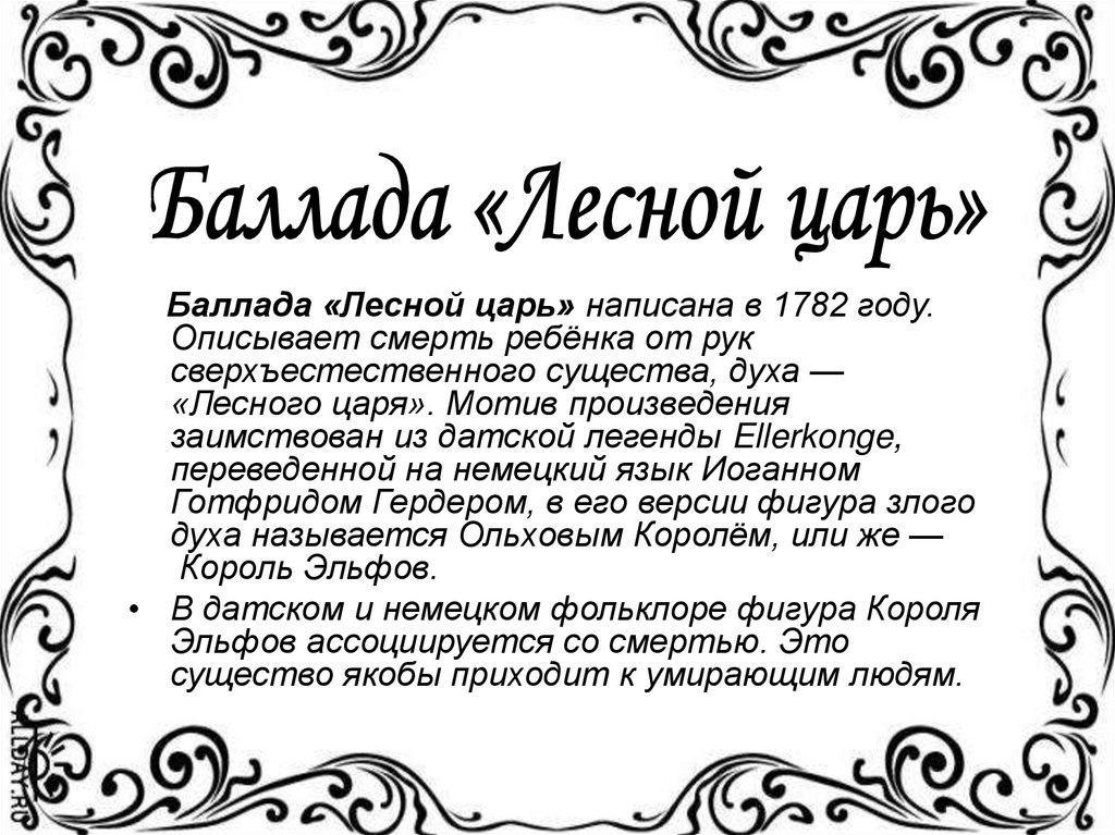 Баллада «Лесной царь» написана в 1782 году.Описывает смерть ребёнка от рук