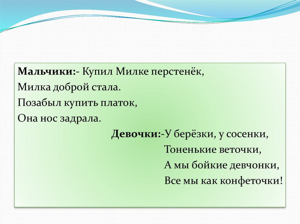 Мальчики:- Купил Милке перстенёк,Милка доброй стала.