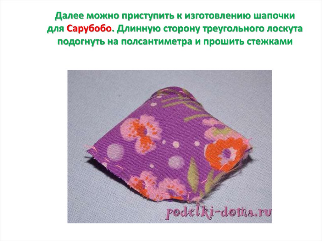 Далее можно приступить к изготовлению шапочкидля Сарубобо. Длинную сторону треугольного лоскута