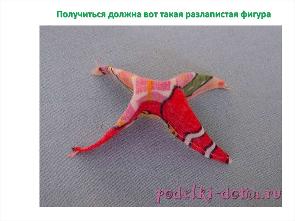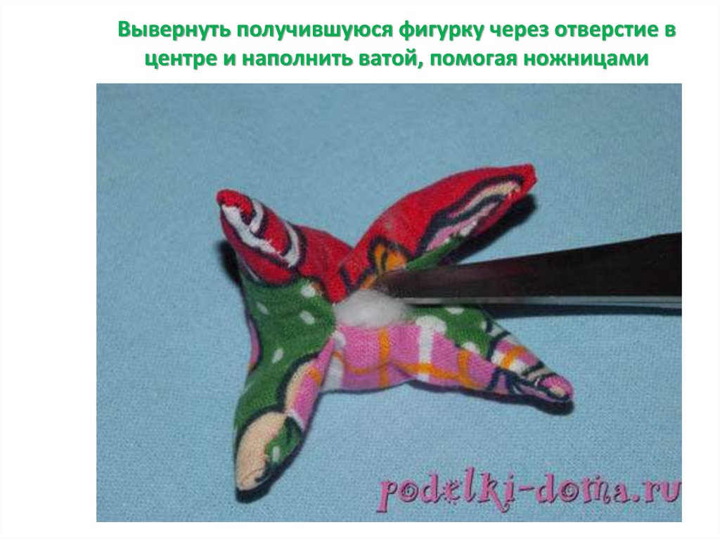 Вывернуть получившуюся фигурку через отверстие вцентре и наполнить ватой, помогая ножницами