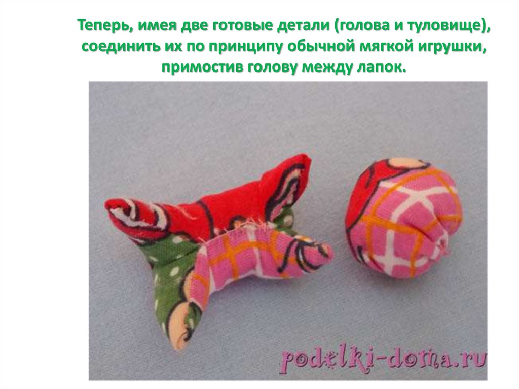 Теперь, имея две готовые детали (голова и туловище),соединить их по принципу обычной мягкой игрушки,