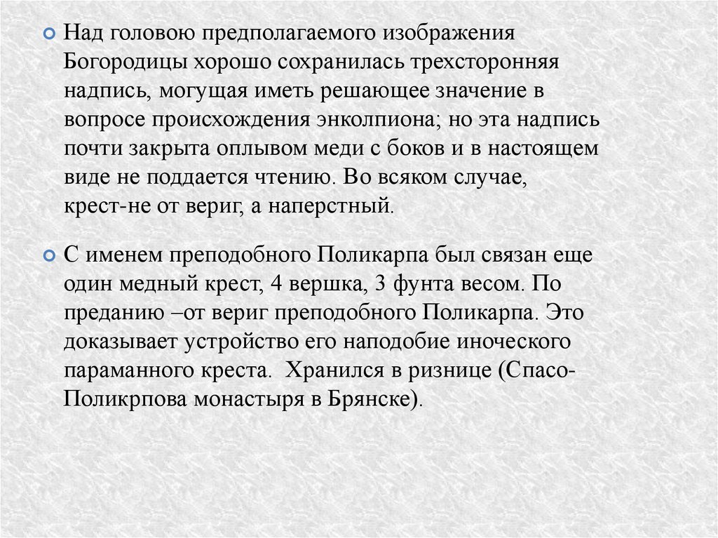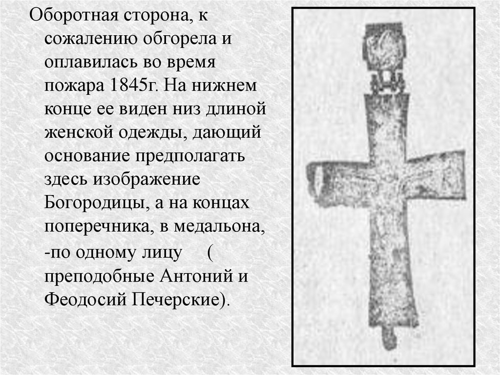 параманного креста. Хранился в ризнице (СпасоПоликрпова монастыря в Брянске).