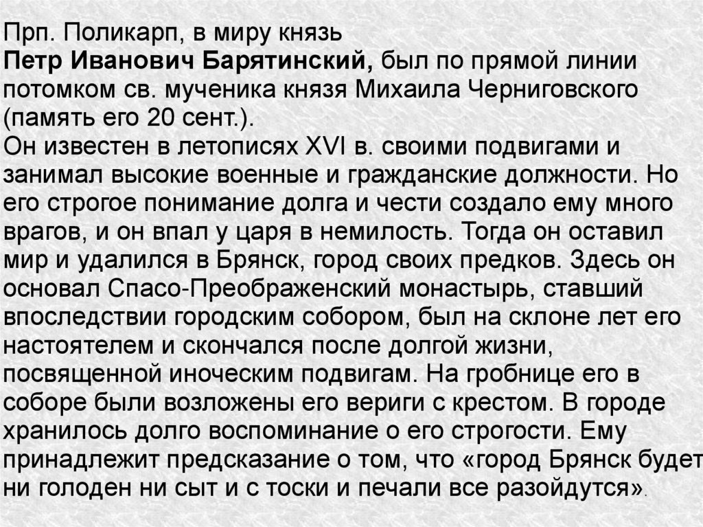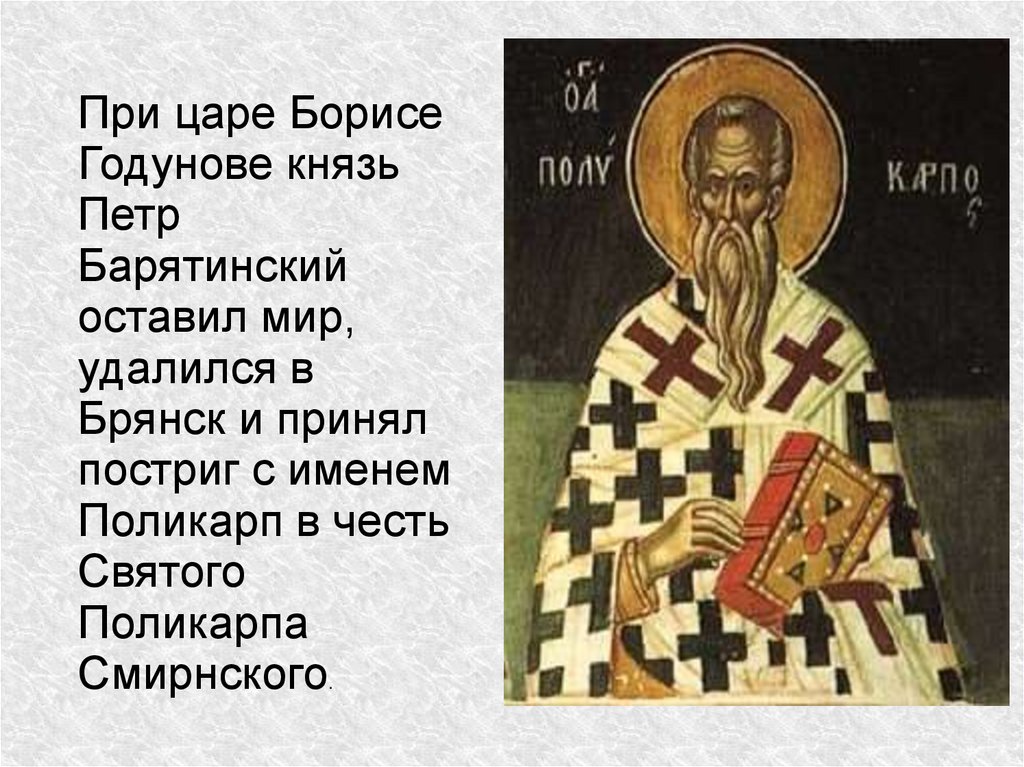 Прп. Поликарп, в миру князьПетр Иванович Барятинский, был по прямой линии