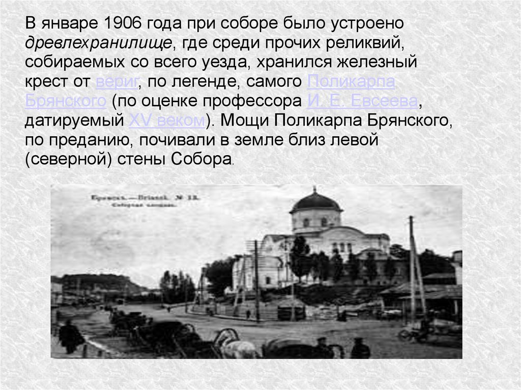 В январе 1906 года при соборе было устроенодревлехранилище, где среди прочих реликвий,