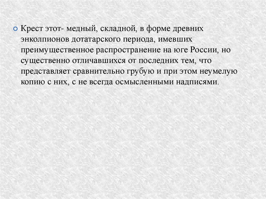 Крест этот- медный, складной, в форме древнихэнколпионов дотатарского периода, имевших