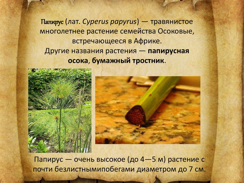 Папирус (лат. Cyperus papyrus) — травянистоемноголетнее растение семейства Осоковые,