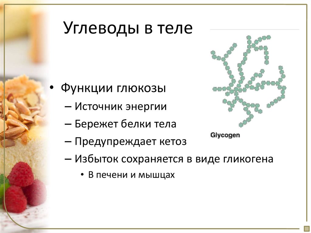 Углеводы в теле• Функции глюкозы