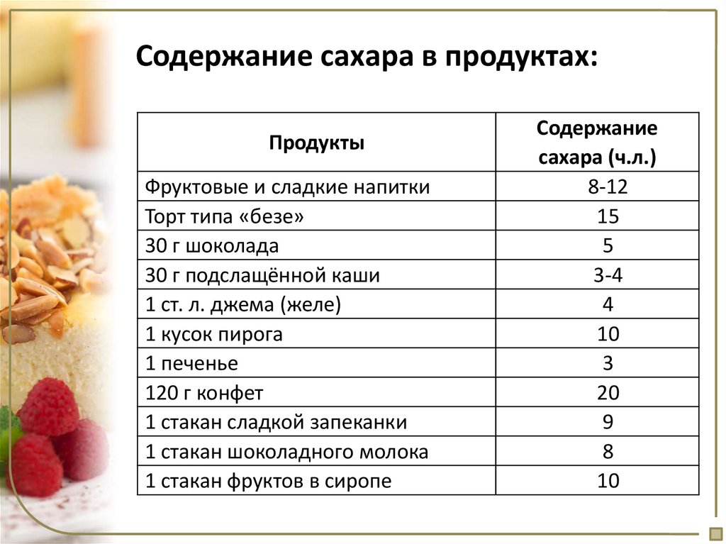 Содержание сахара в продуктах:Продукты