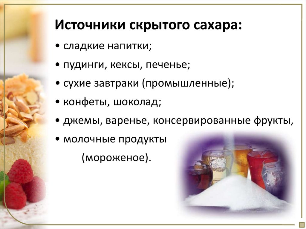Источники скрытого сахара:• сладкие напитки;
