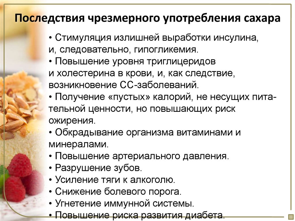 Последствия чрезмерного употребления сахара• Стимуляция излишней выработки инсулина,