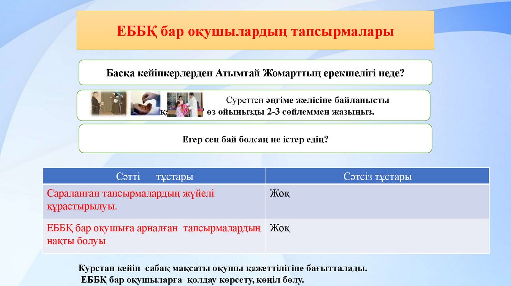 ЕББҚ бар оқушылардың тапсырмаларыБасқа кейіпкерлерден Атымтай Жомарттың ерекшелігі неде?