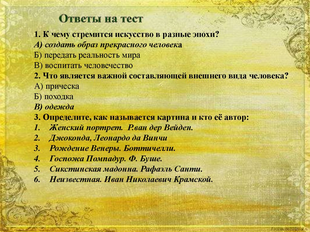 1. К чему стремится искусство в разные эпохи?А) создать образ прекрасного человека