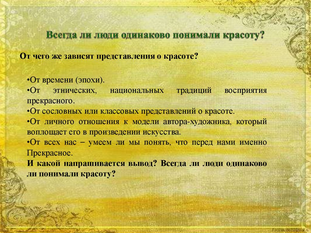 От чего же зависят представления о красоте?•От времени (эпохи).