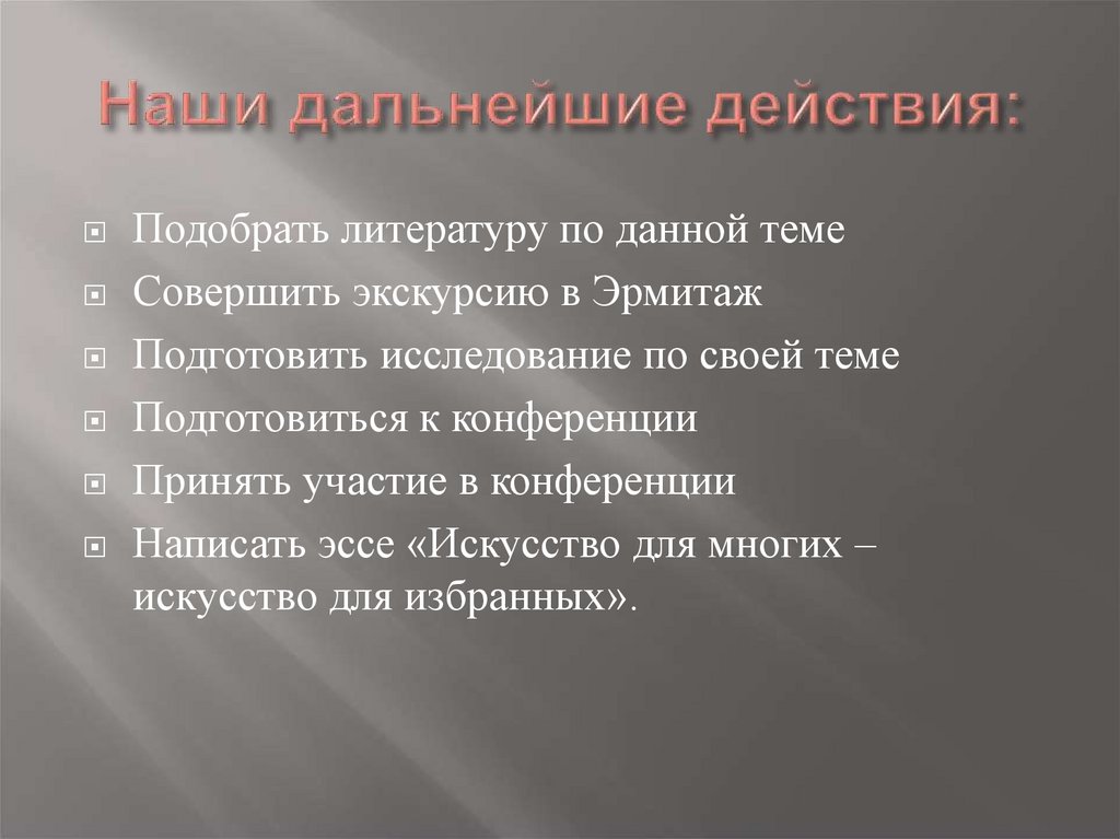 Подобрать литературу по данной темеСовершить экскурсию в Эрмитаж