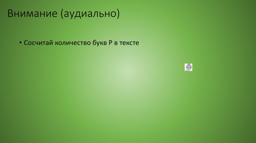 Внимание (аудиально)• Сосчитай количество букв Р в тексте