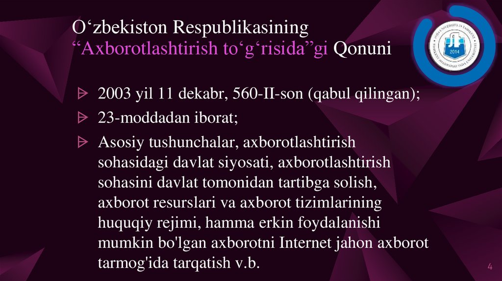 O‘zbekiston Respublikasining“Axborotlashtirish to‘g‘risida”gi Qonuni