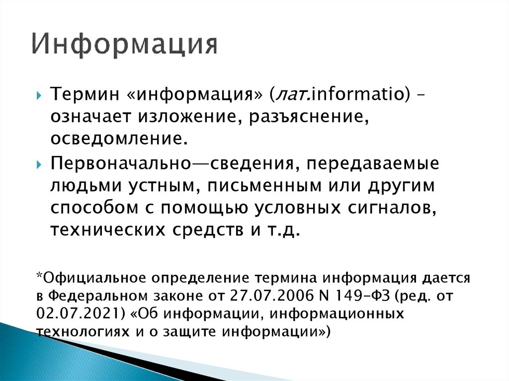 Термин «информация» (лат.informatio) –означает изложение, разъяснение,