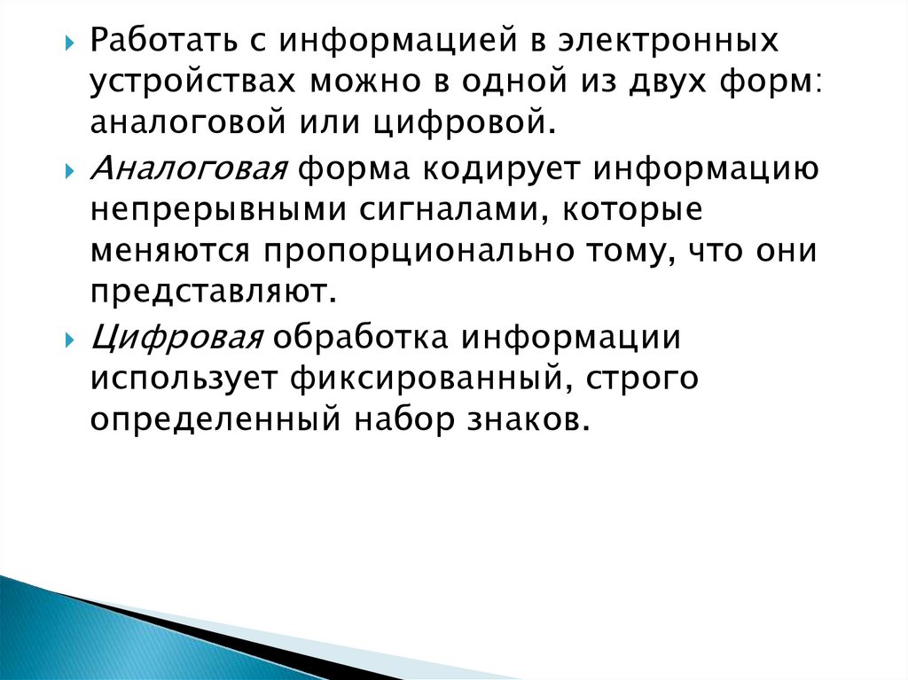 Работать с информацией в электронныхустройствах можно в одной из двух форм: