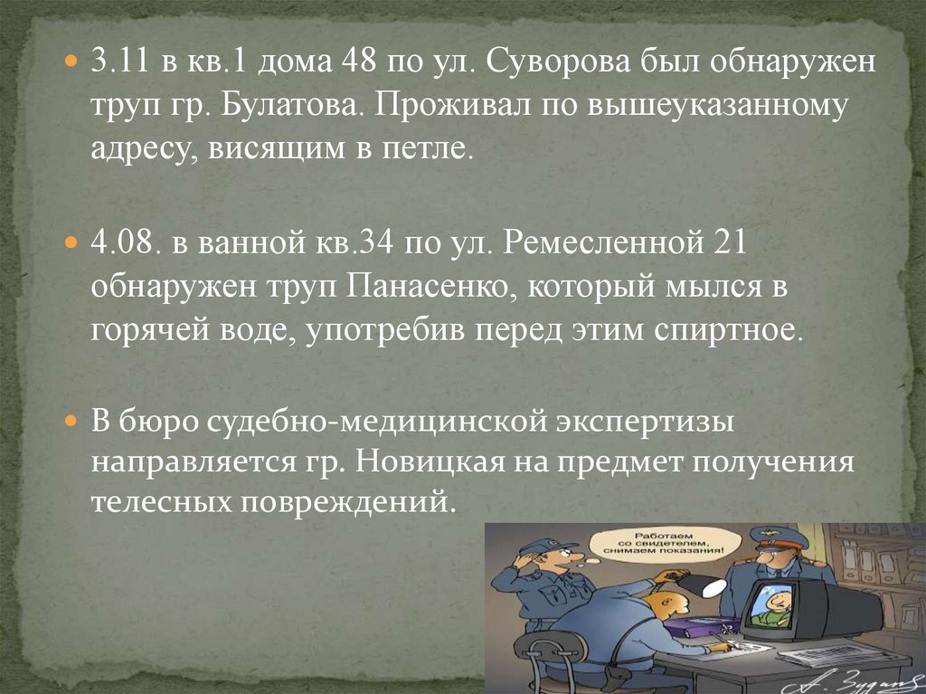 3.11 в кв.1 дома 48 по ул. Суворова был обнаружентруп гр. Булатова. Проживал по вышеуказанному